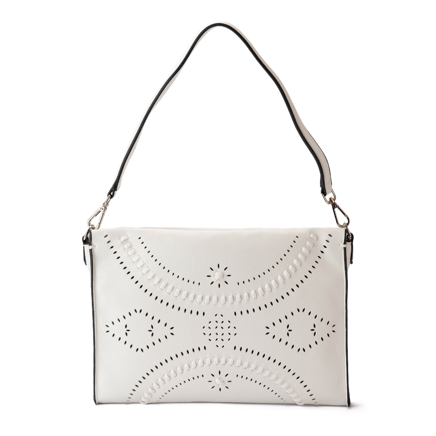 Geantă de damă Angelina în culoare alb delicat, confecționată din piele ecologică de înaltă calitate. Modelul impresionează prin perforații decorative și detalii fine, care oferă un accent stilat și feminin. Dispune de mâner scurt pentru purtare pe umăr și baretă lungă reglabilă suplimentară pentru mai mult confort. Compartimentul principal este prevăzut cu fermoar pentru depozitarea sigură a obiectelor.