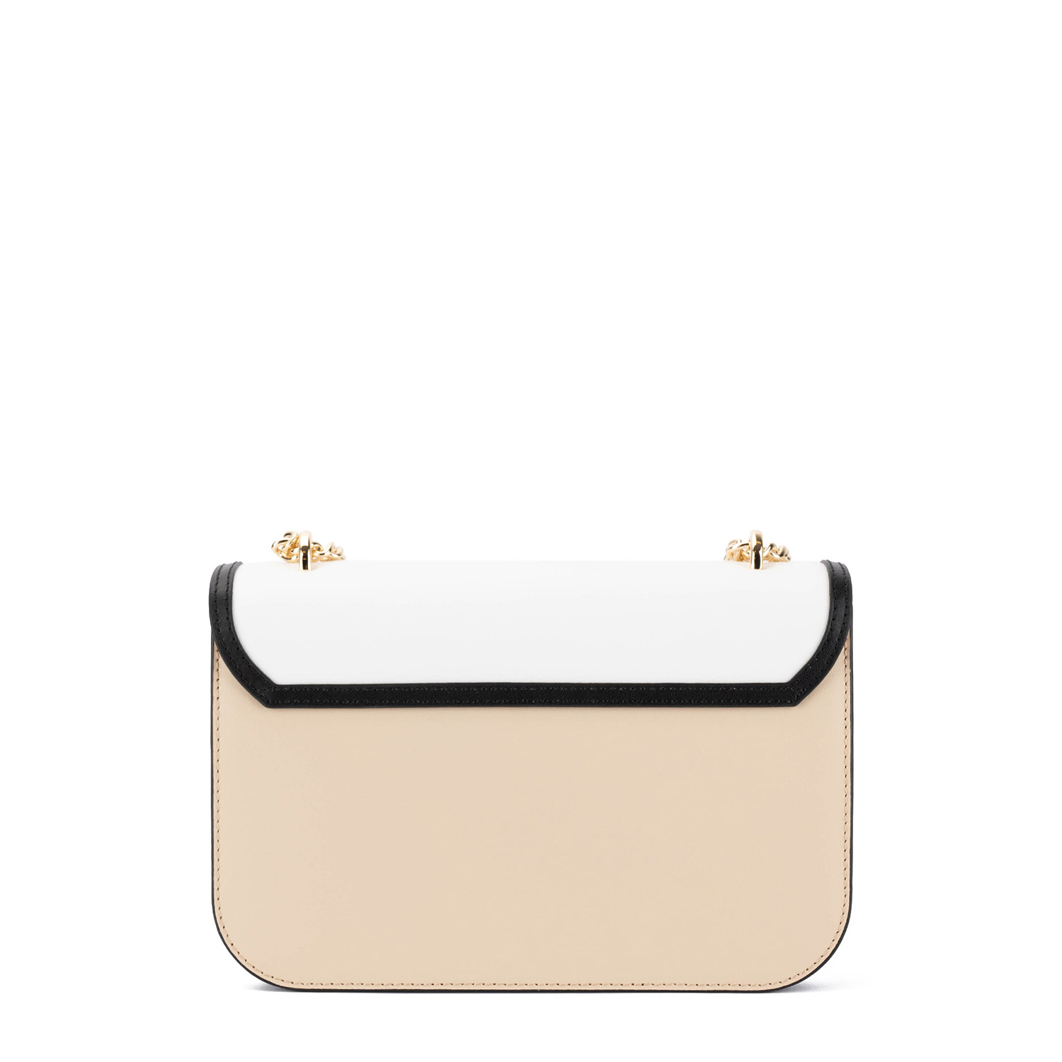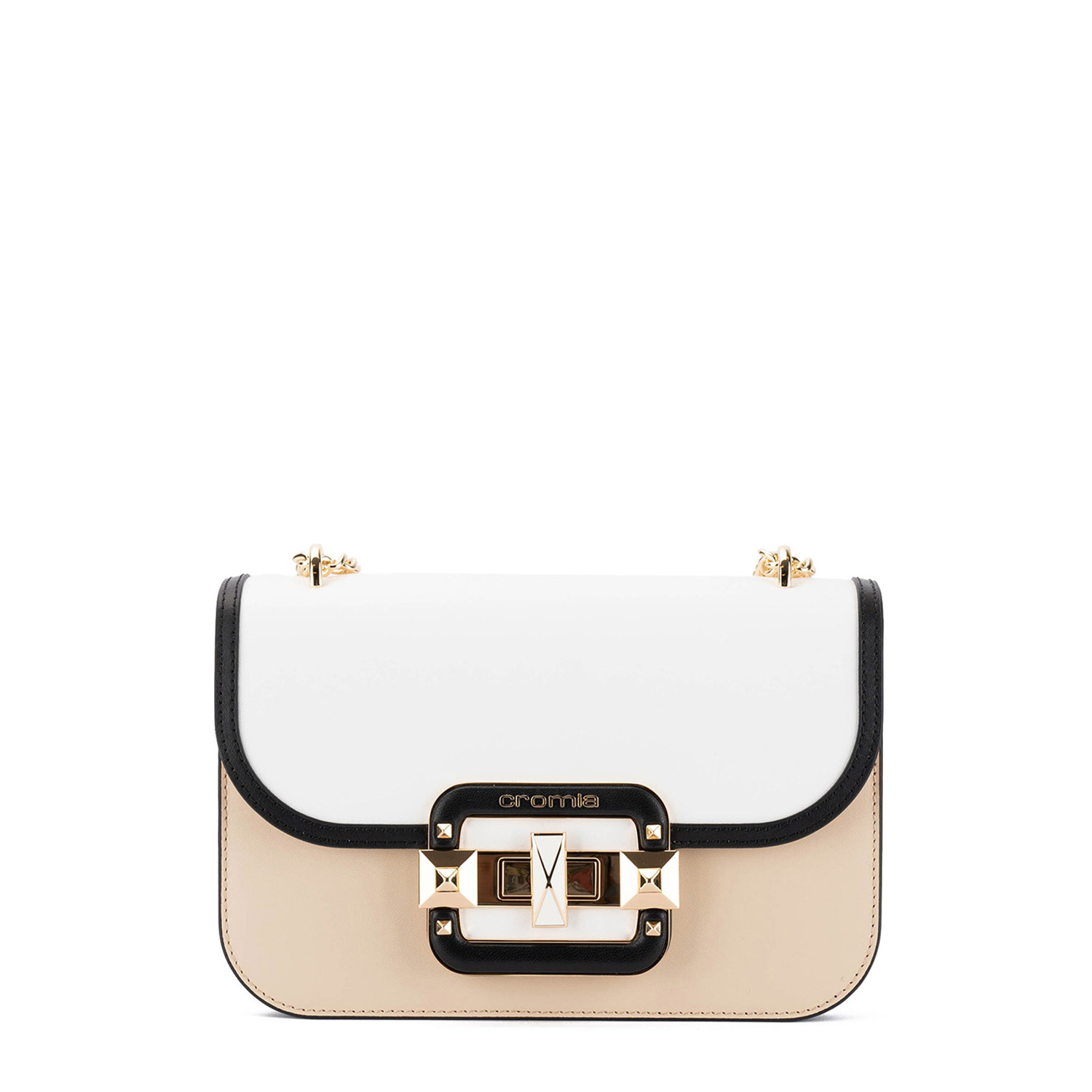 Geantă elegantă, realizată din piele netedă, cu o formă compactă și un design distinctiv. Modelul dispune de o închidere metalică decorativă de tip turn-lock și o baretă tip lanț, care oferă un accent sofisticat și luxos.