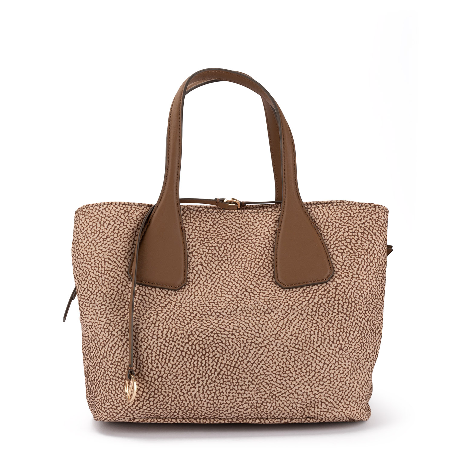 Geantă damă elegantă, confecționată din material textil cu imprimeul caracteristic brandului. Modelul dispune de două compartimente și unul central cu fermoar – pentru siguranță și o organizare practică. Prevăzută cu mânere scurte și o baretă de umăr lungă și reglabilă, precum și un pandantiv cu logo-ul.