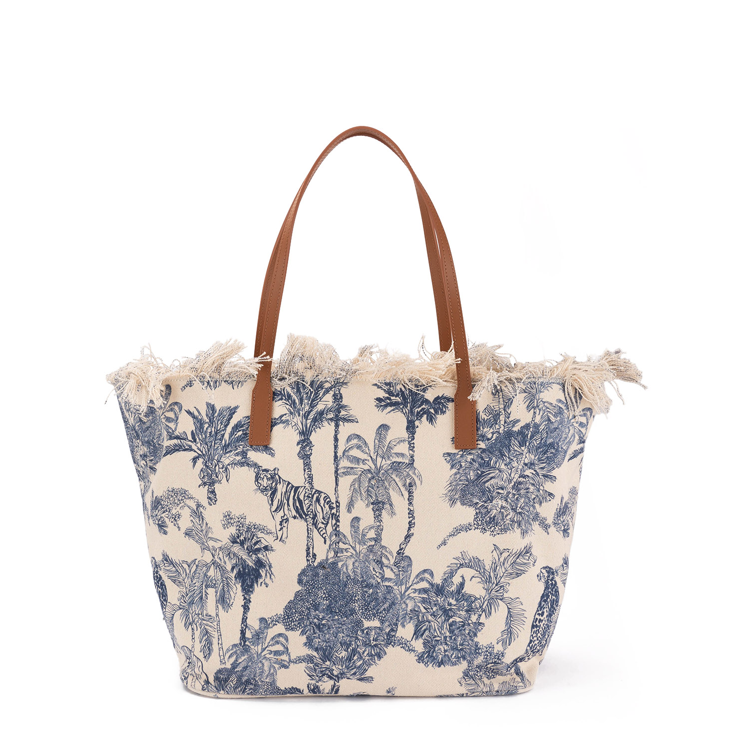City este o geantă cu formă clasică, fabricată din material textil, cu un design floral și animal print. Marginea superioară este decorată cu franjuri, iar partea frontală prezintă un logo brodat. Geanta dispune de mânere scurte confortabile și un buzunar interior.