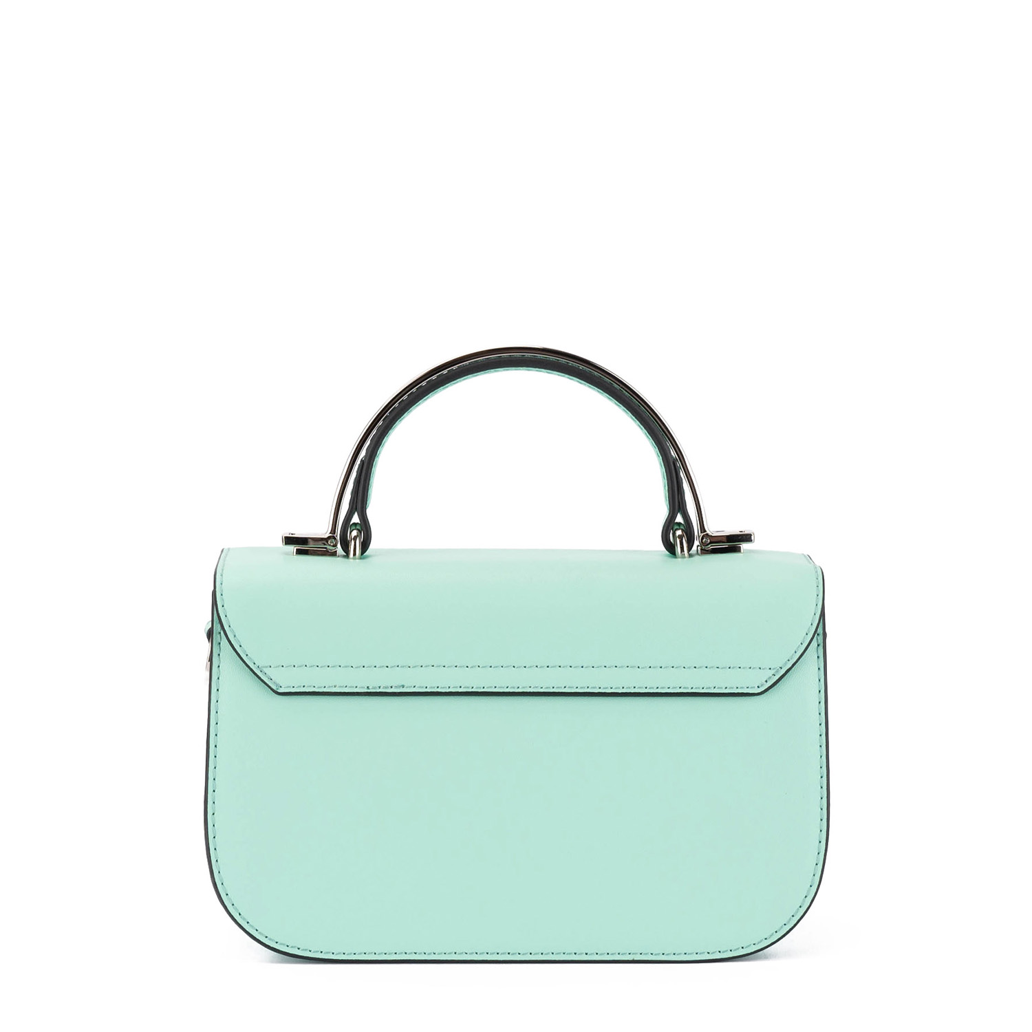 Poșetă elegantă într-o culoare verde pal, fabricată din piele netedă, cu design semplu și modern. Se distinge prin mânerul metalic rigid și cureaua de umăr lungă și detașabilă, ceea ce permite purtarea atât în mână, cât și pe umăr. Dispune de o clapetă decorată cu logoul mărcii și un buzunar interior cu fermoar. Un accent perfect pentru ținute pline de stil.