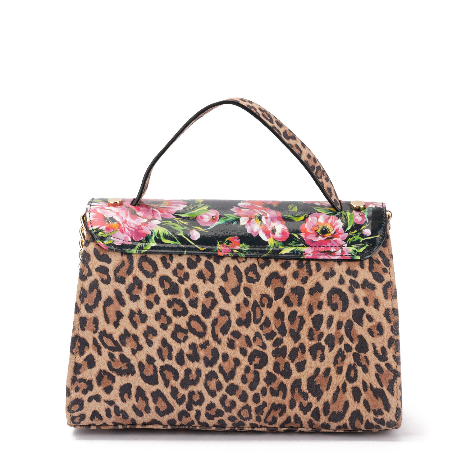Geantă damă stilată, cu un imprimeu leopard spectaculos, combinat cu o clapetă cu motiv floral. Modelul este practic și elegant, având un mâner scurt confortabil și o baretă detașabilă tip lanț, pentru diferite moduri de purtare. Dispune de un compartiment, un buzunar interior cu fermoar și o plăcuță metalică cu logoul mărcii.
