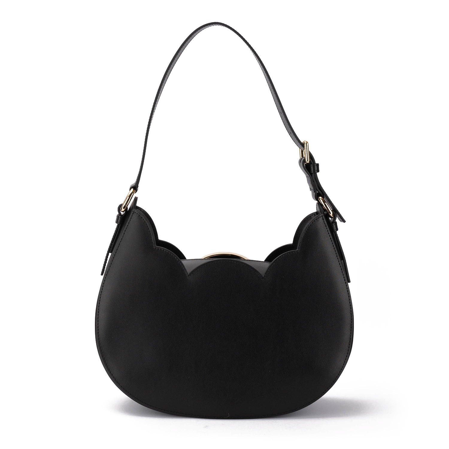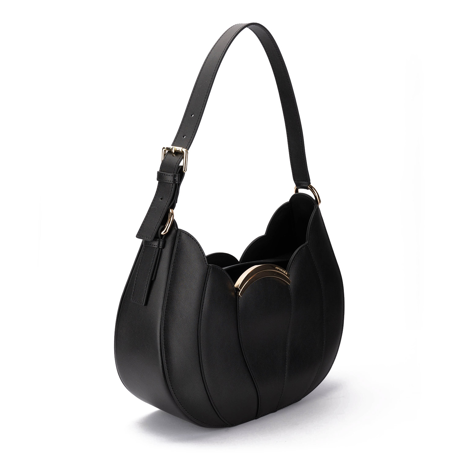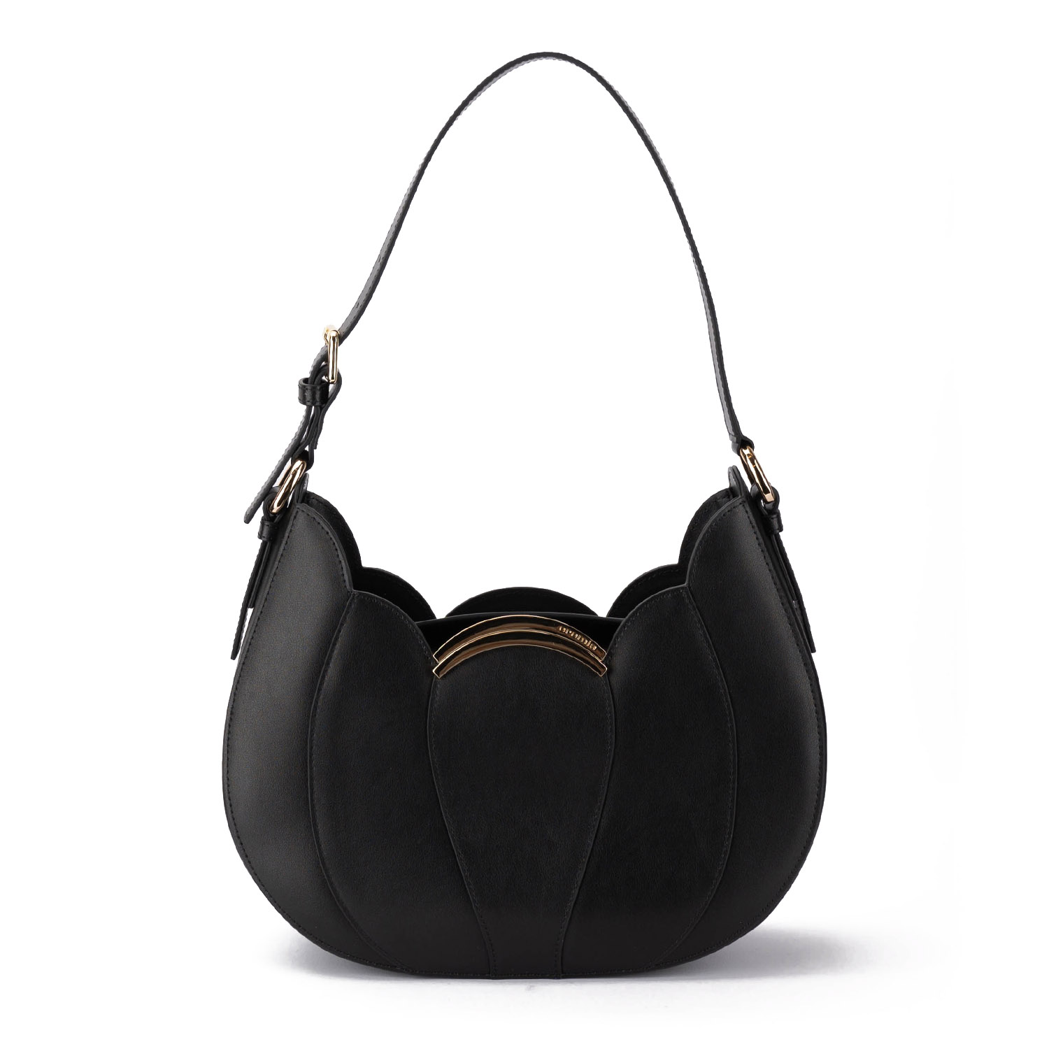 Geantă elegantă cu formă florală, realizată din piele netedă. Modelul dispune de închidere magnetică, baretă de umăr reglabilă și un design minimalist cu logo-ul mărcii.