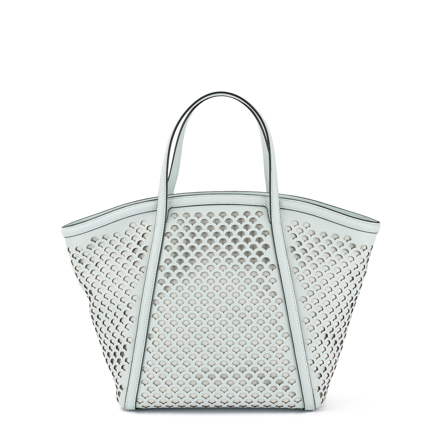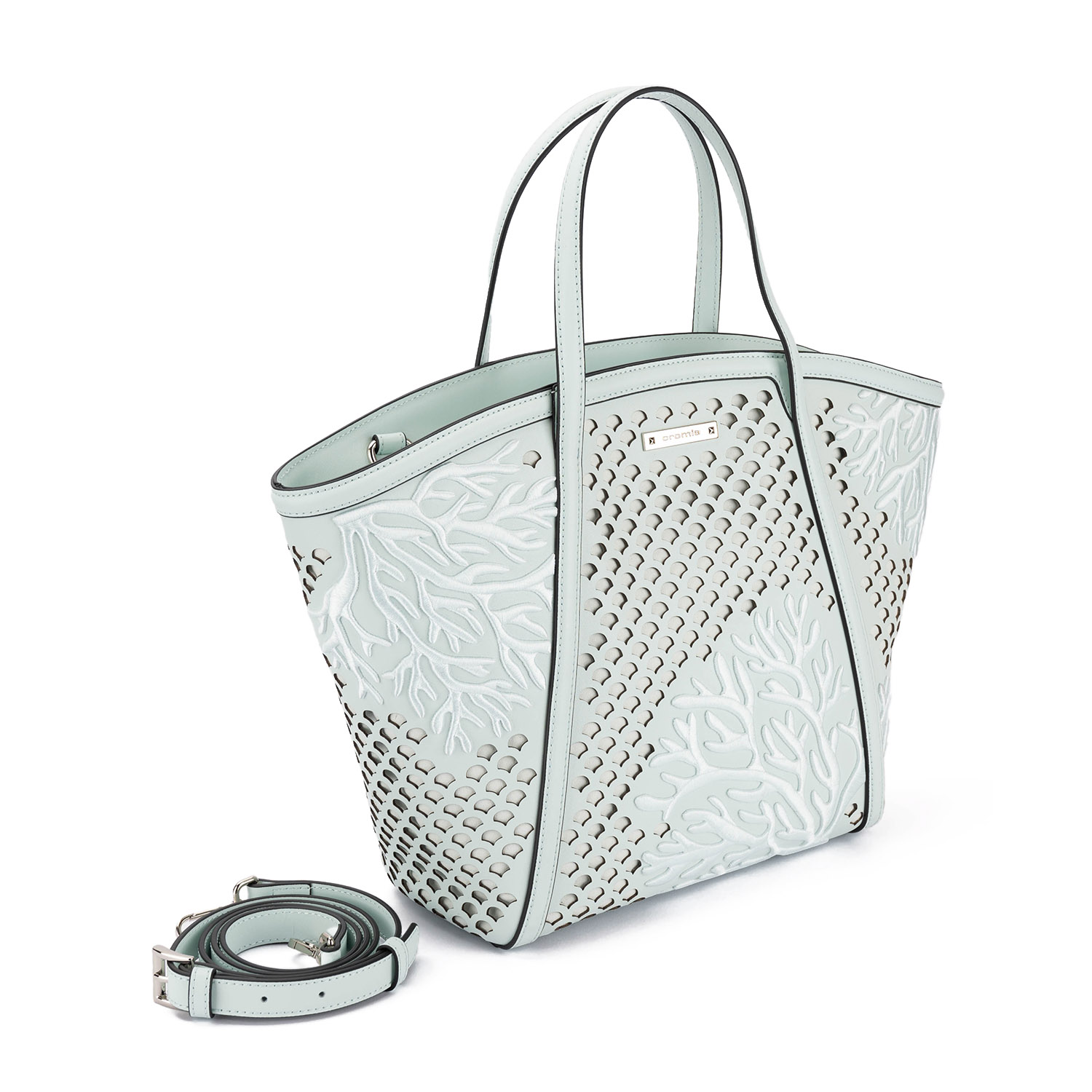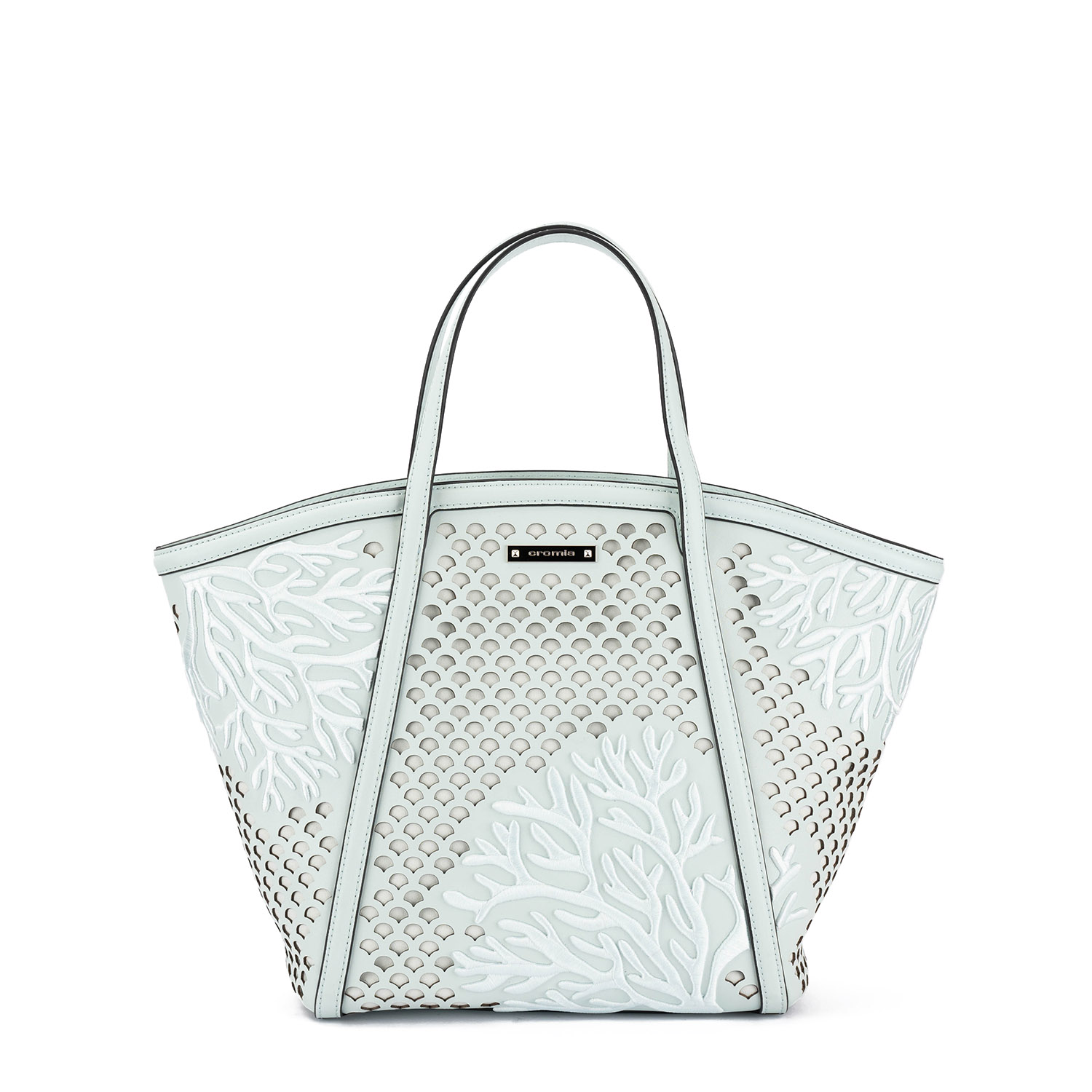 Geantă tote spectaculoasă (tip deschis),cu un design artistic inspirat din formele marine. Modelul impresionează prin perforații și broderii tip „coral”. Realizată din piele de înaltă calitate, aceasta îmbină stilul cu funcționalitatea – fiind ideală pentru utilizarea cotidiană și look-urile de vară. Dispune de mânere lungi pentru purtarea pe umăr și de o baretă detașabilă și reglabilă.