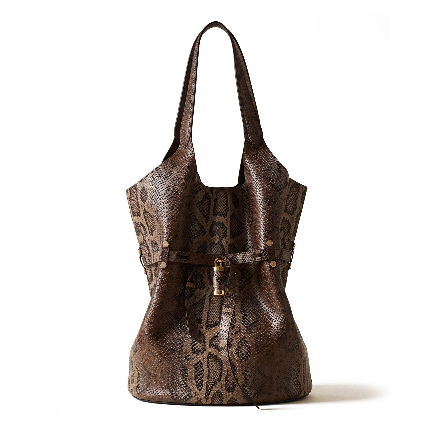 Geantă bucket de lux, confecționată din piele cu imprimeu de șarpe. Dispune de o baretă decorativă cu lacăt, logo metalic și accesorii metalice aurii mate – un design distinctiv, plin de caracter.