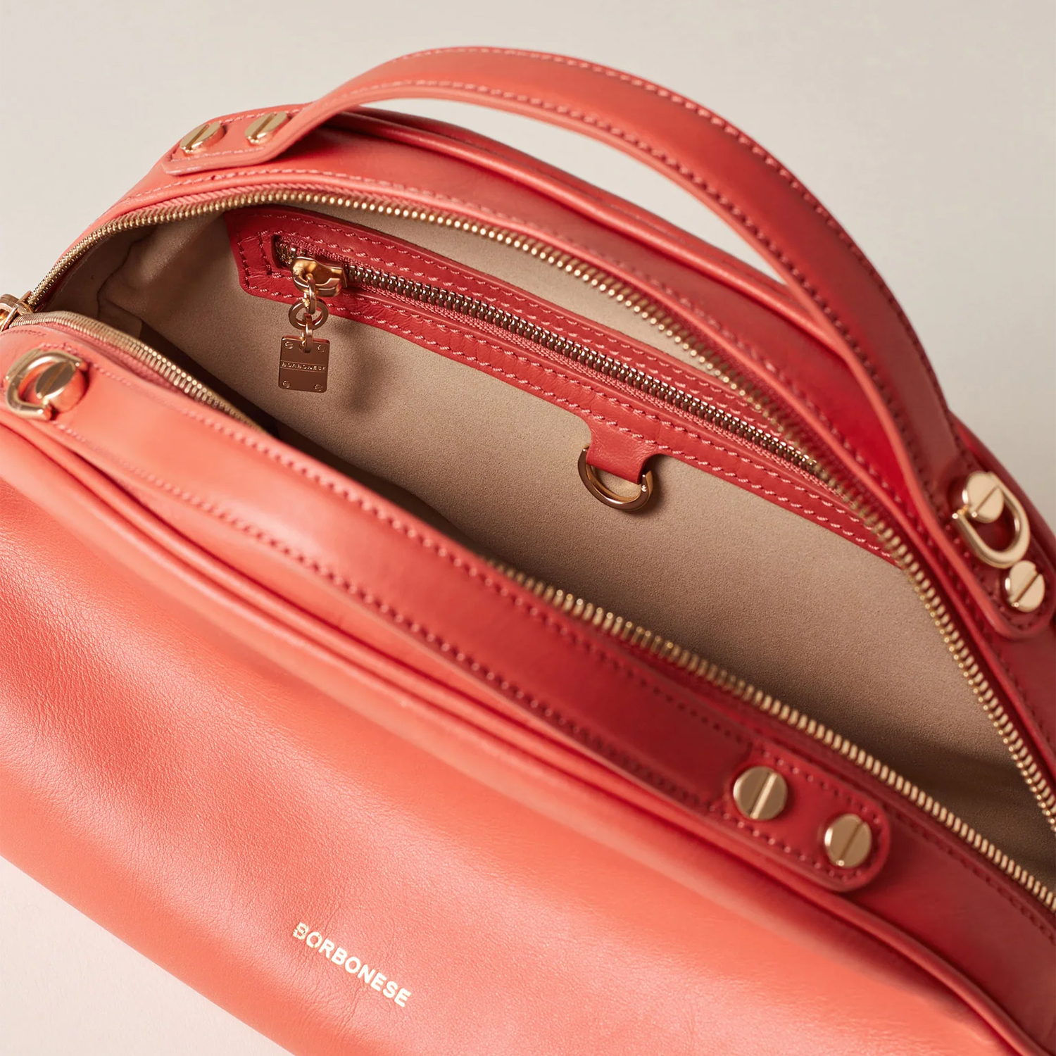 Poșetă elegantă din piele nappa, cu formă clasică bowler. Modelul dispune de fermoar cu cursor dublu, buzunare interioare și o barieră de umăr reglabilă și detașabilă. Finisată cu accesorii metalice aurii mate.