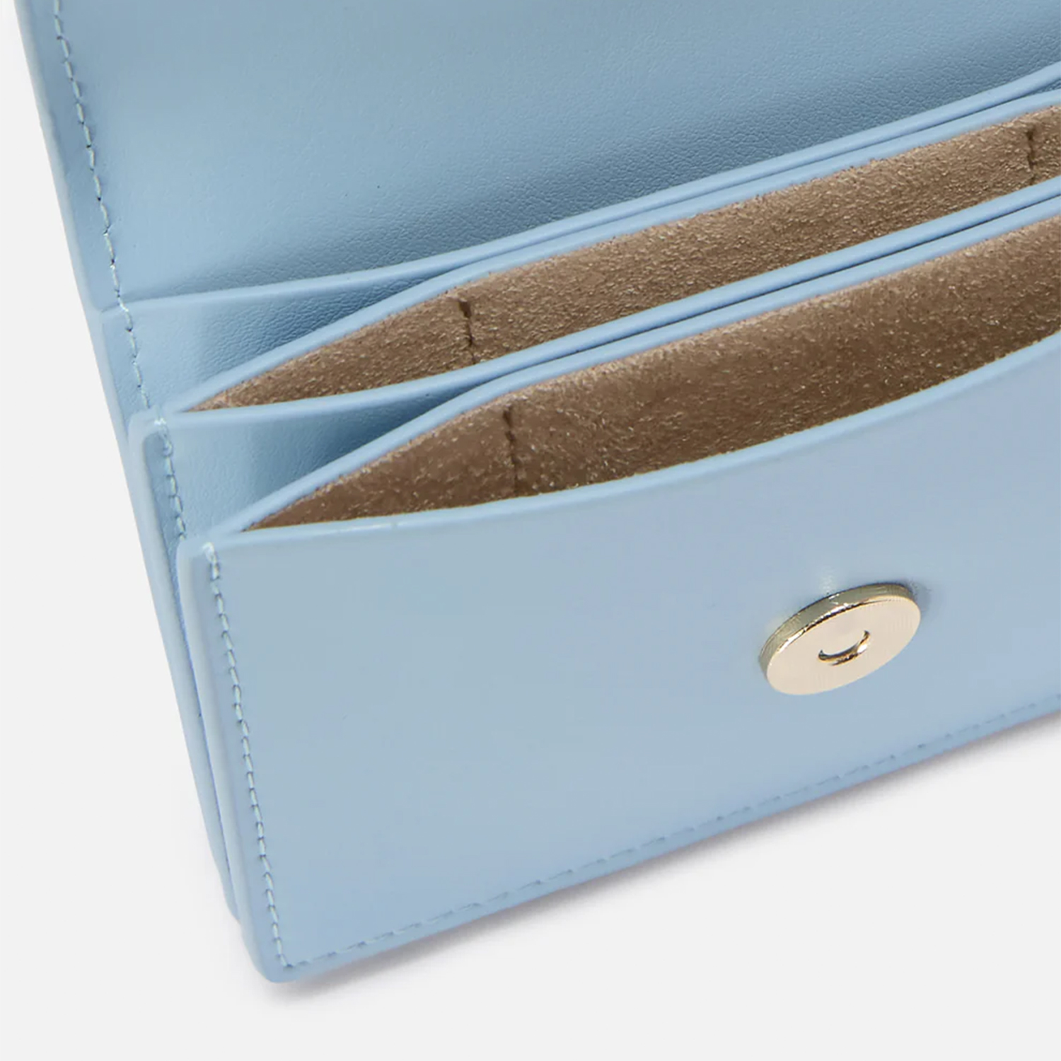 Portcard albastru pal, realizat din piele netedă. Dispune de două compartimente pentru carduri, un buzunar pentru monede cu închidere prin capsă și o plăcuță metalică cu log-ul.