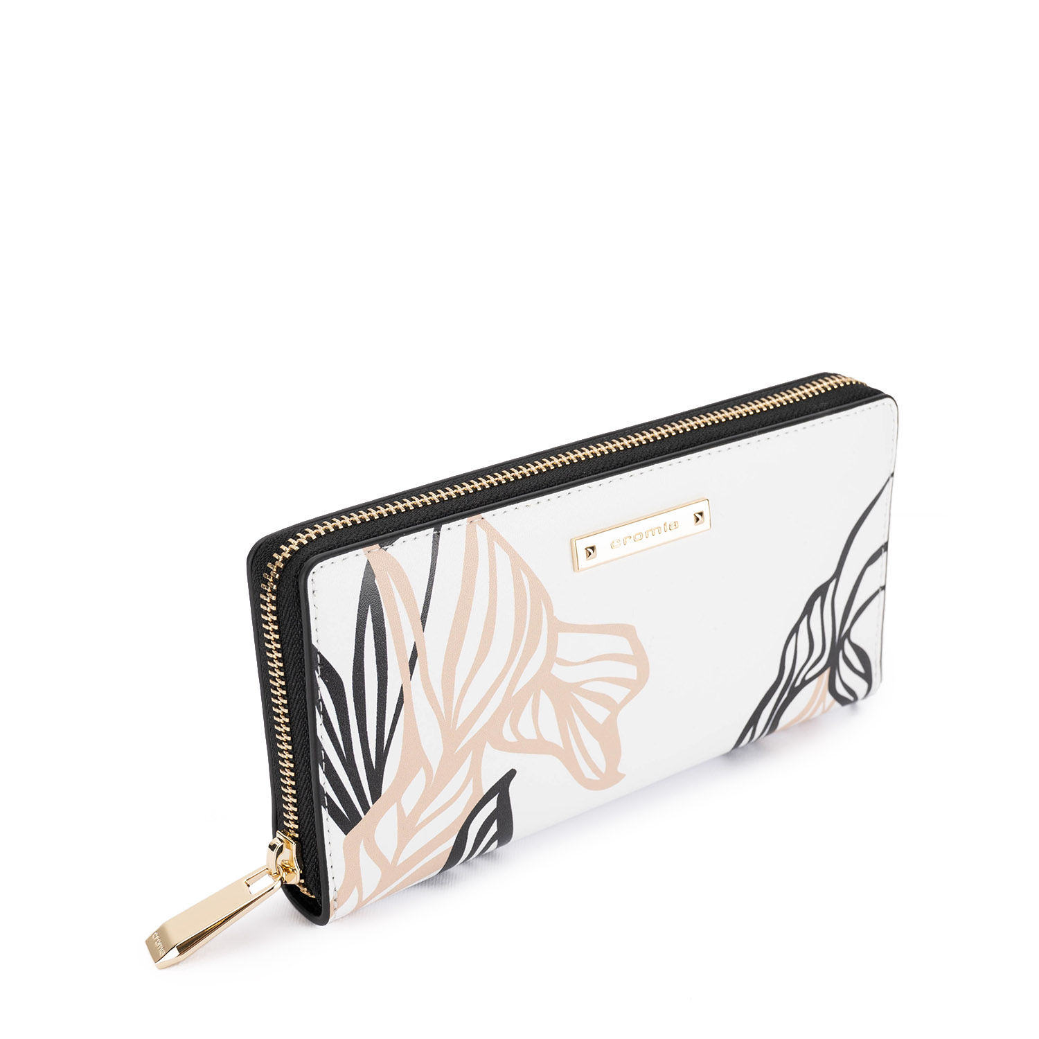 Portofel stilat, fabricat din piele naturală netedă, cu un imprimeu floral frumos și un design elegant. Modelul dispune de fermoar și un spațiu interior bine organizat, cu compartimente pentru carduri, bancnote și monede, oferind confort în utilizarea zilnică .