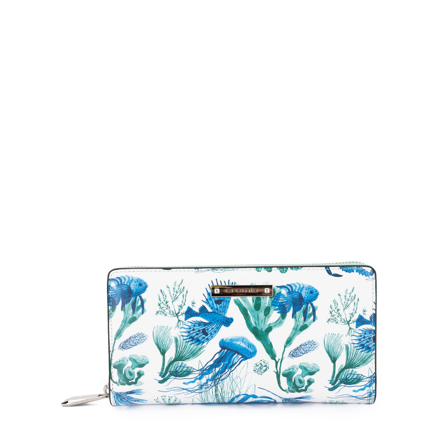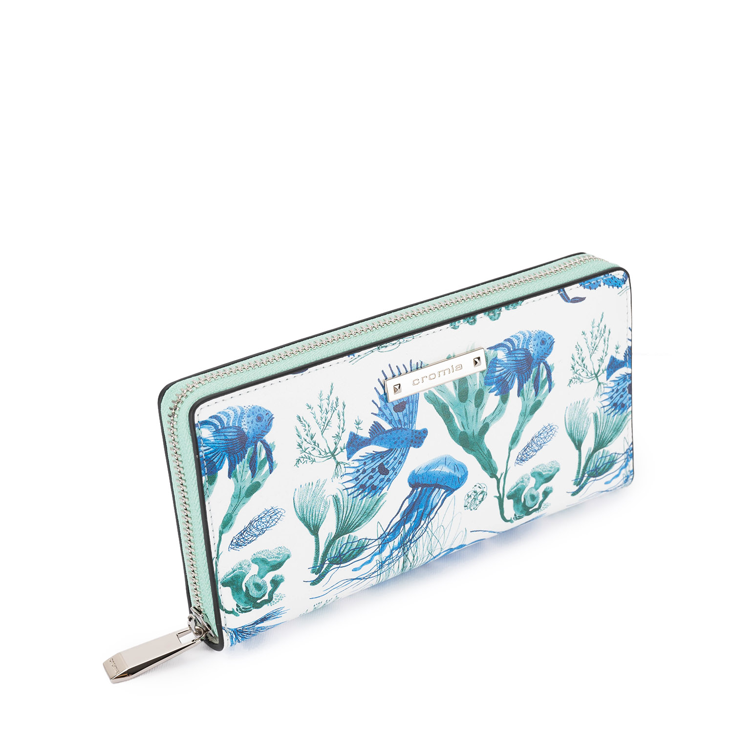 Portofel elegant, fabricat din piele naturală netedă cu un imprimeu marin modern. Modelul este prevăzut cu fermoar și o compartimentare interioară practică, având spații pentru carduri, bancnote și monede.