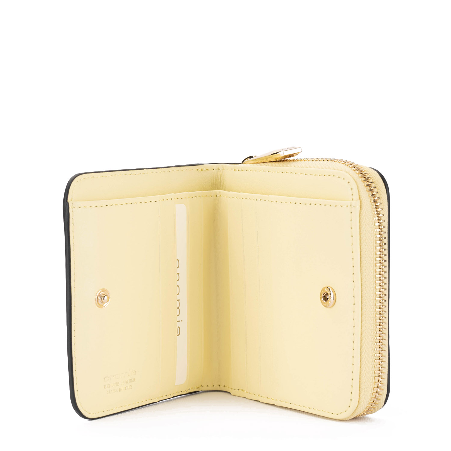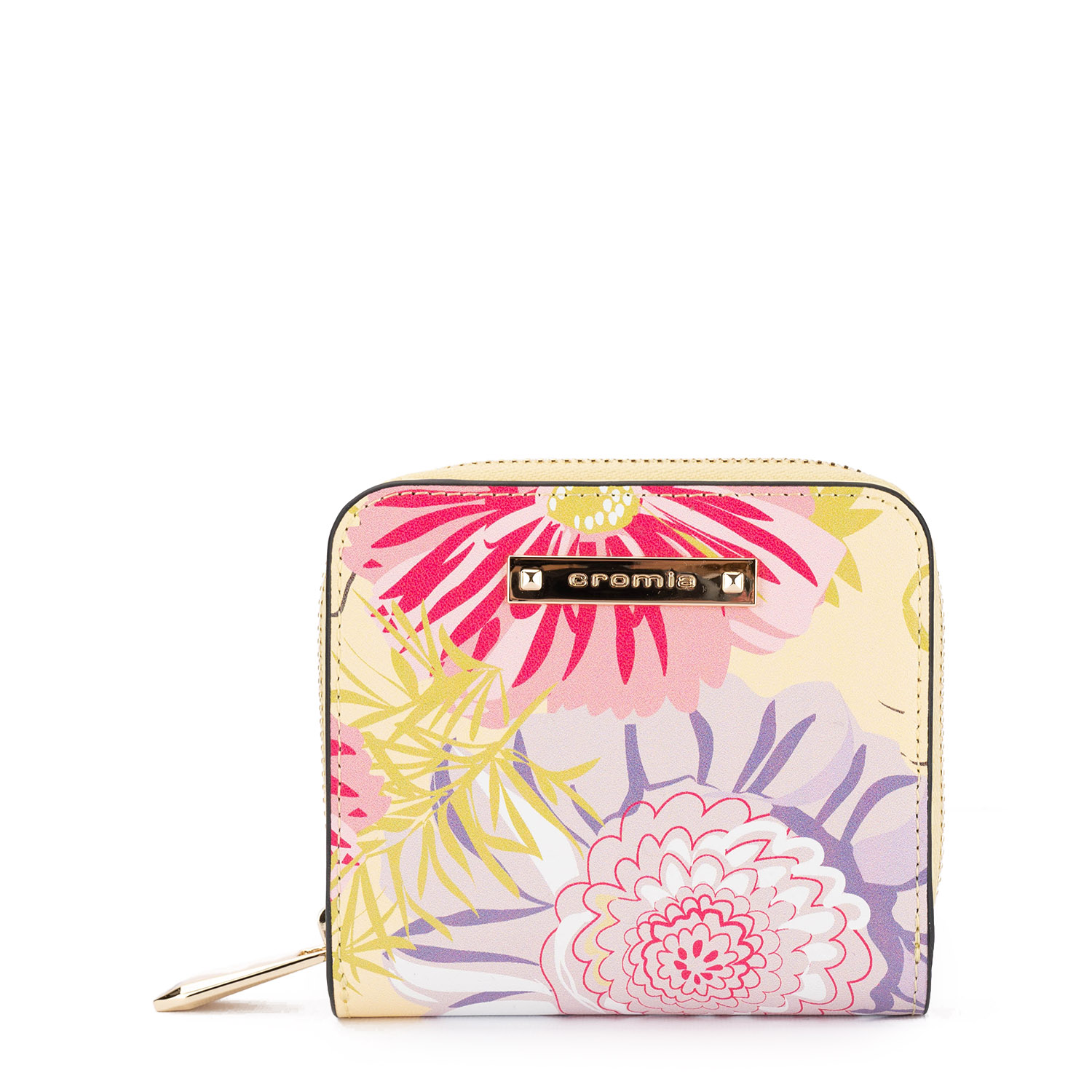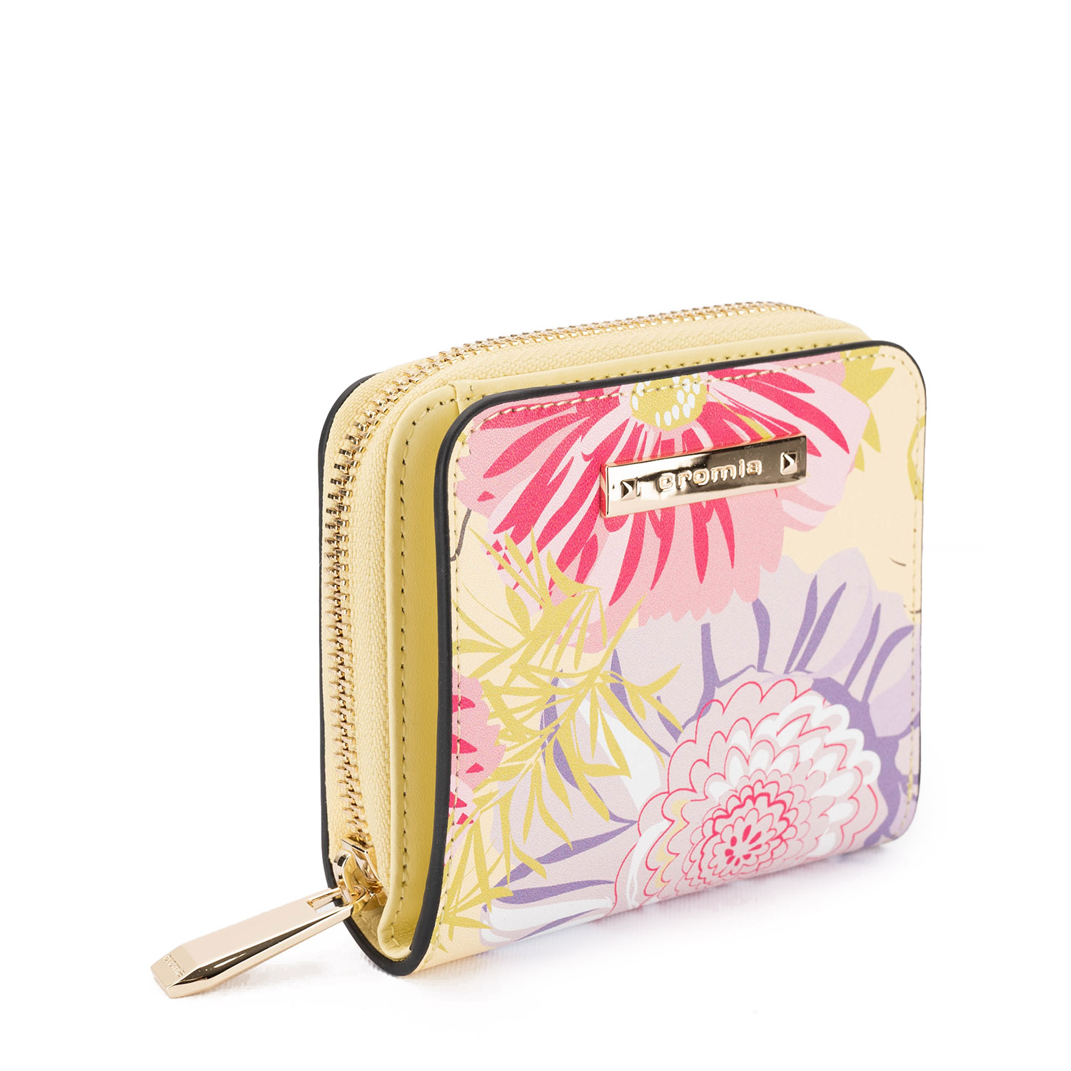 Portofel compact, fabricat din piele naturală netedă, cu un imprimeu floral colorat și proaspăt . Modelul dispune de o compartimentare interioară practică, cu spații pentru carduri, bancnote și un buzunar pentru monede cu fermoar.