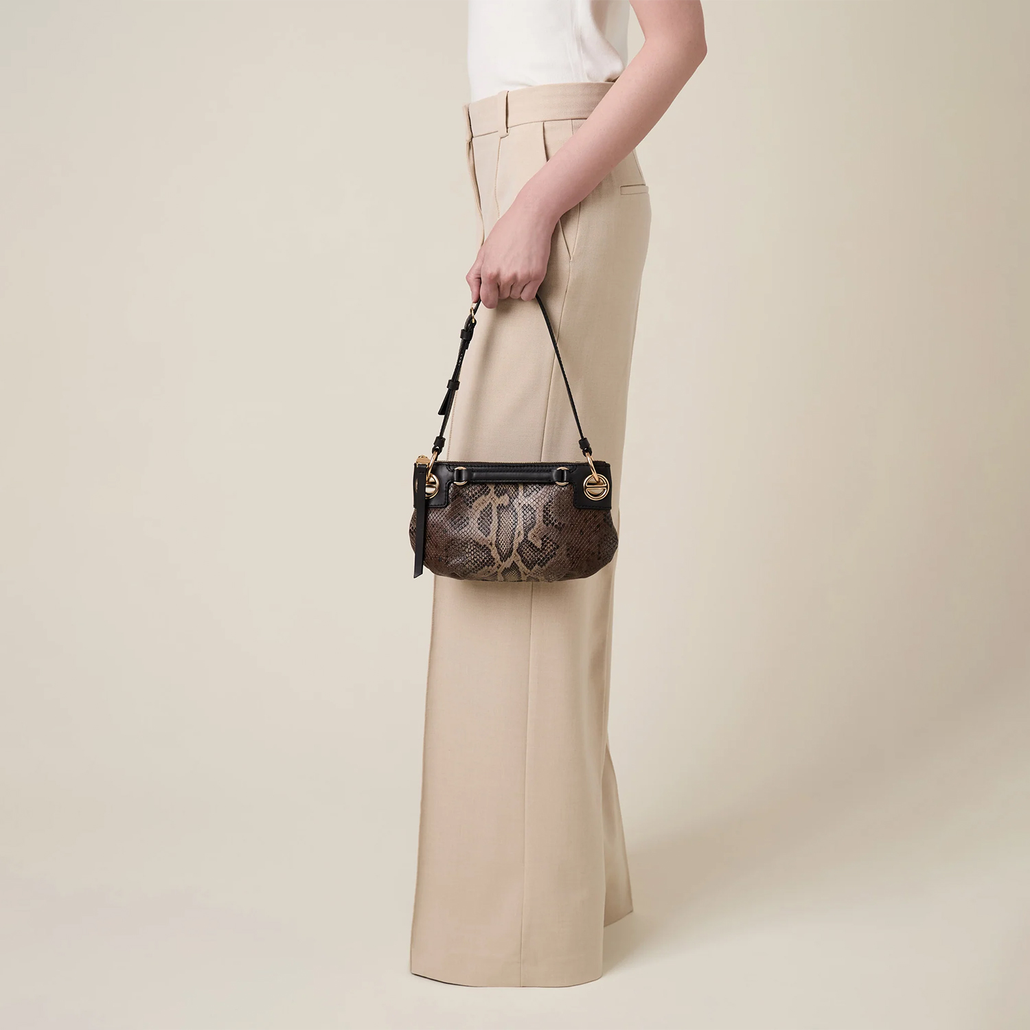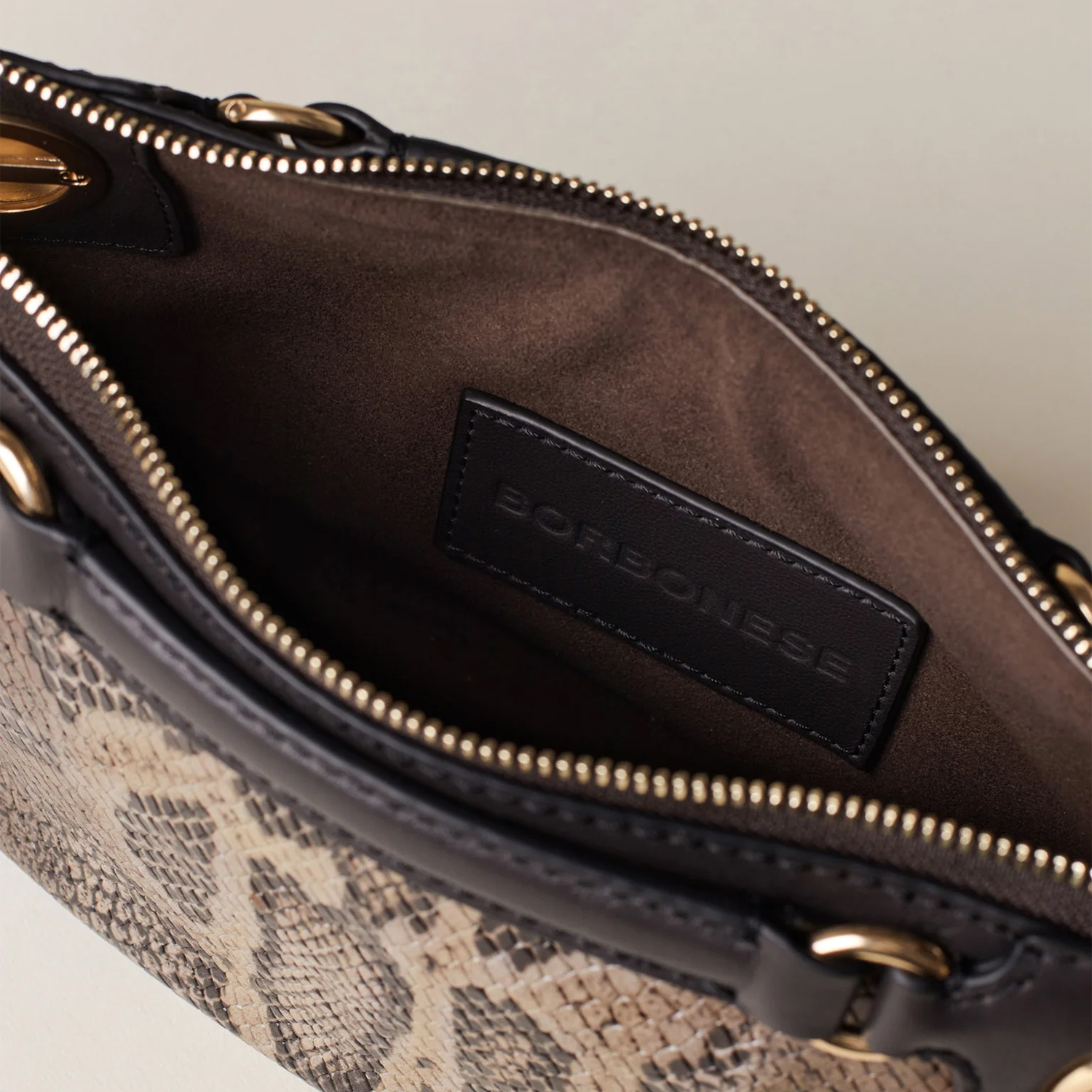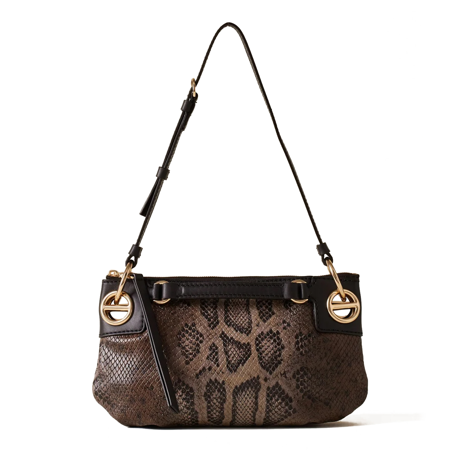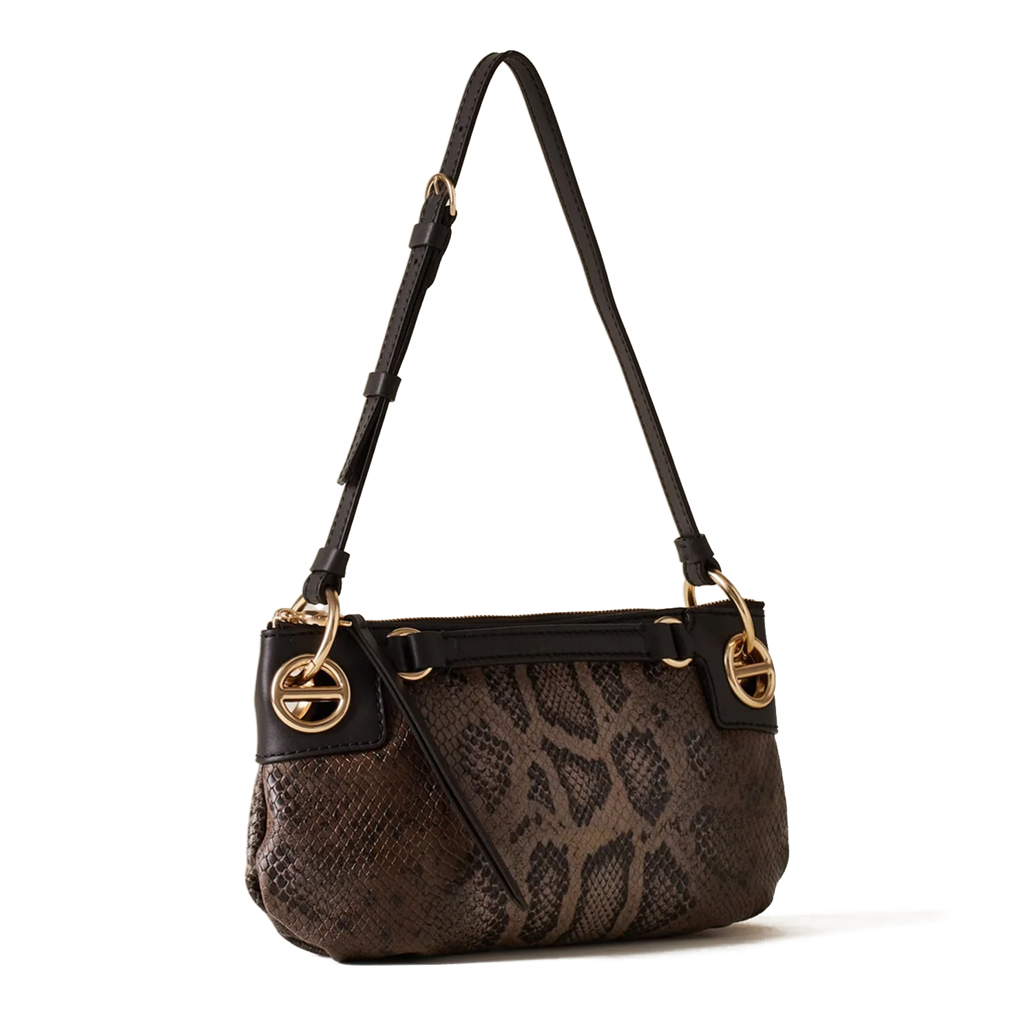 Poșetă cu design minimalist și aspect modern, confecționată din piele cu imprimeu șarpe, cu fermoar metalic și compartimentare interioară funcțională. Dispune de o curea de umăr detașabilă și reglabilă, elemente decorative de tip șurub și accesorii metalice aurii mate.