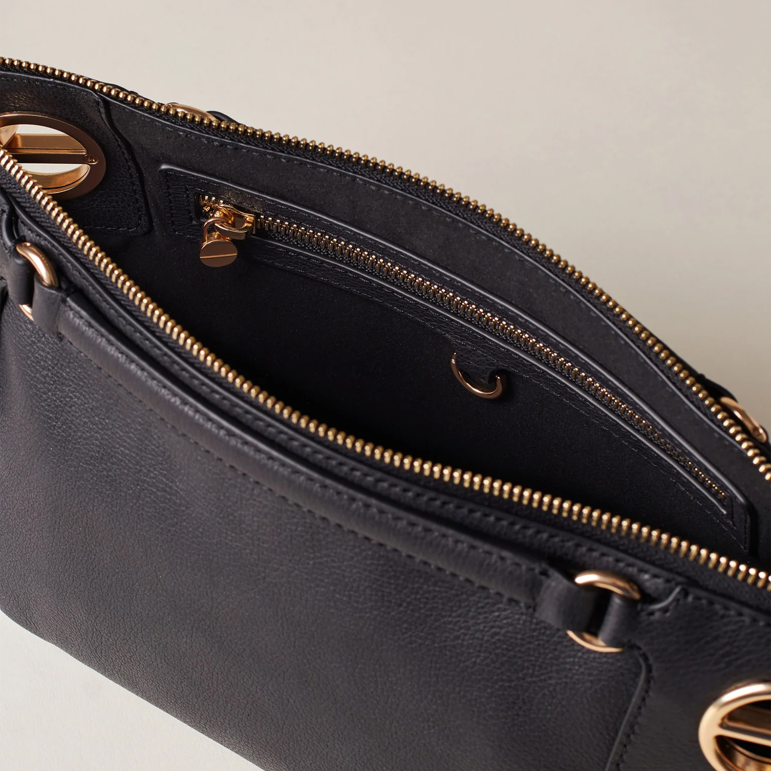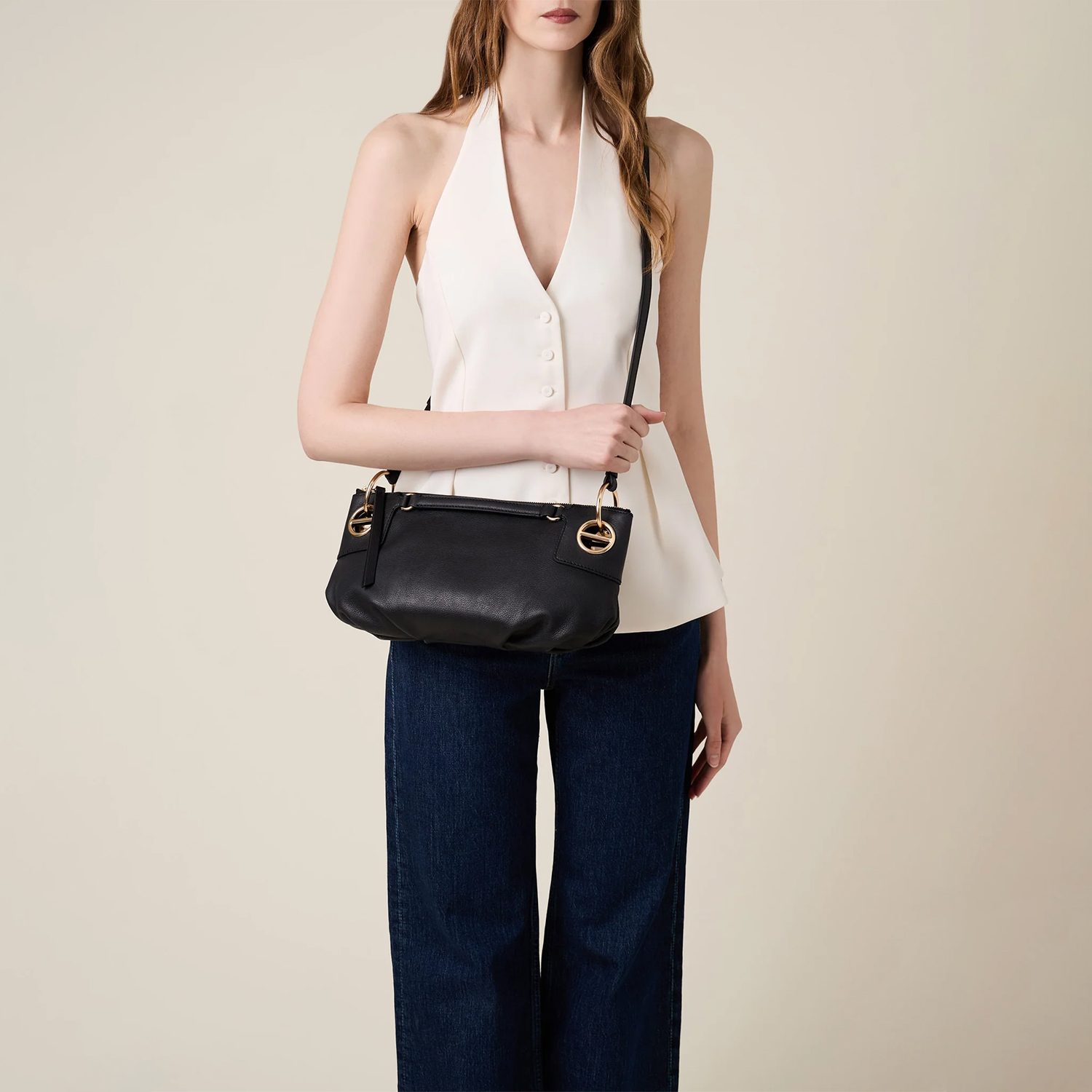 Geantă compactă, confecționată din piele șagrin, cu fermoar metalic și compartimentare interioară funcțională. Dispune o curea de umăr detașabilă și reglabilă, elemente decorative de tip șurub și accesorii metalice aurii mate.