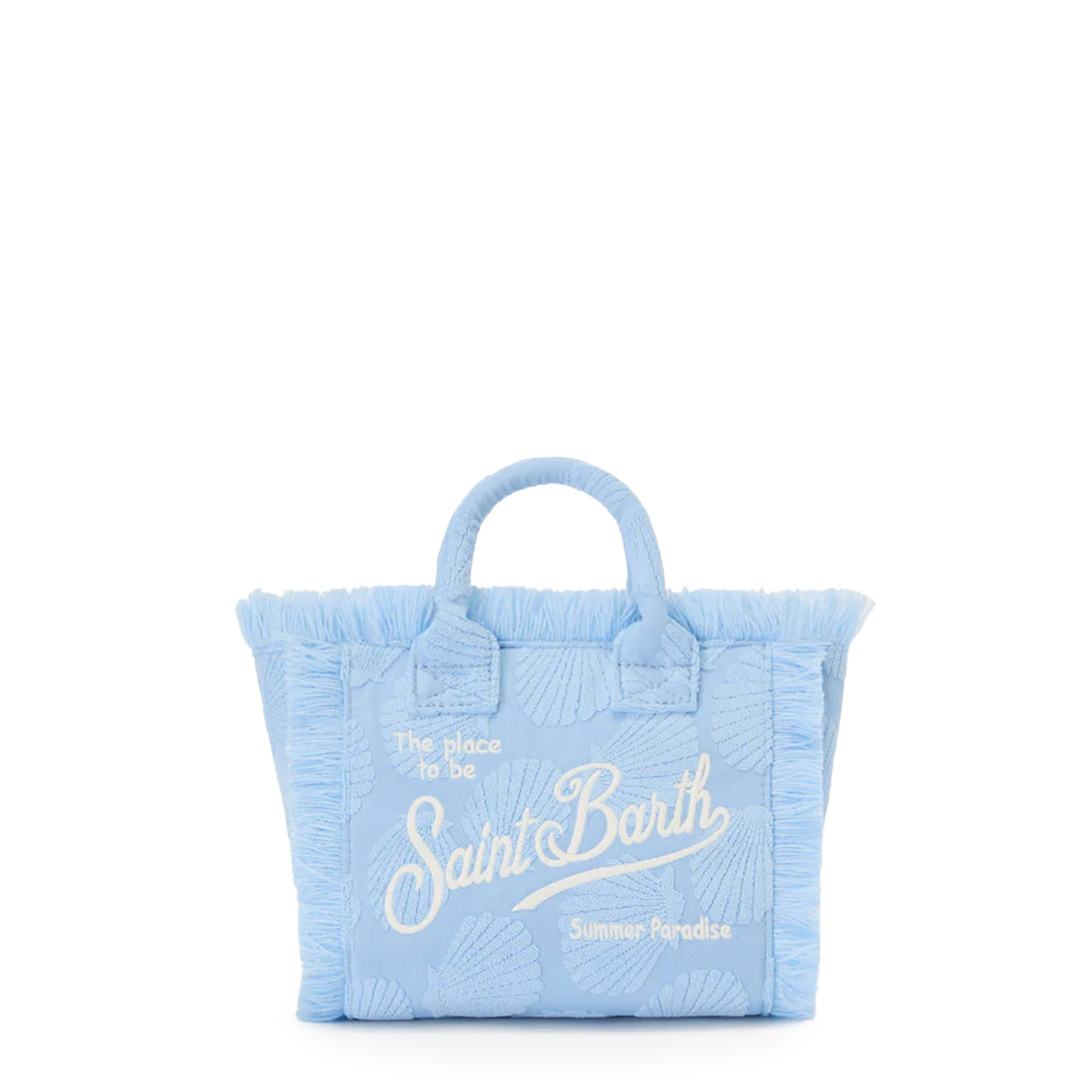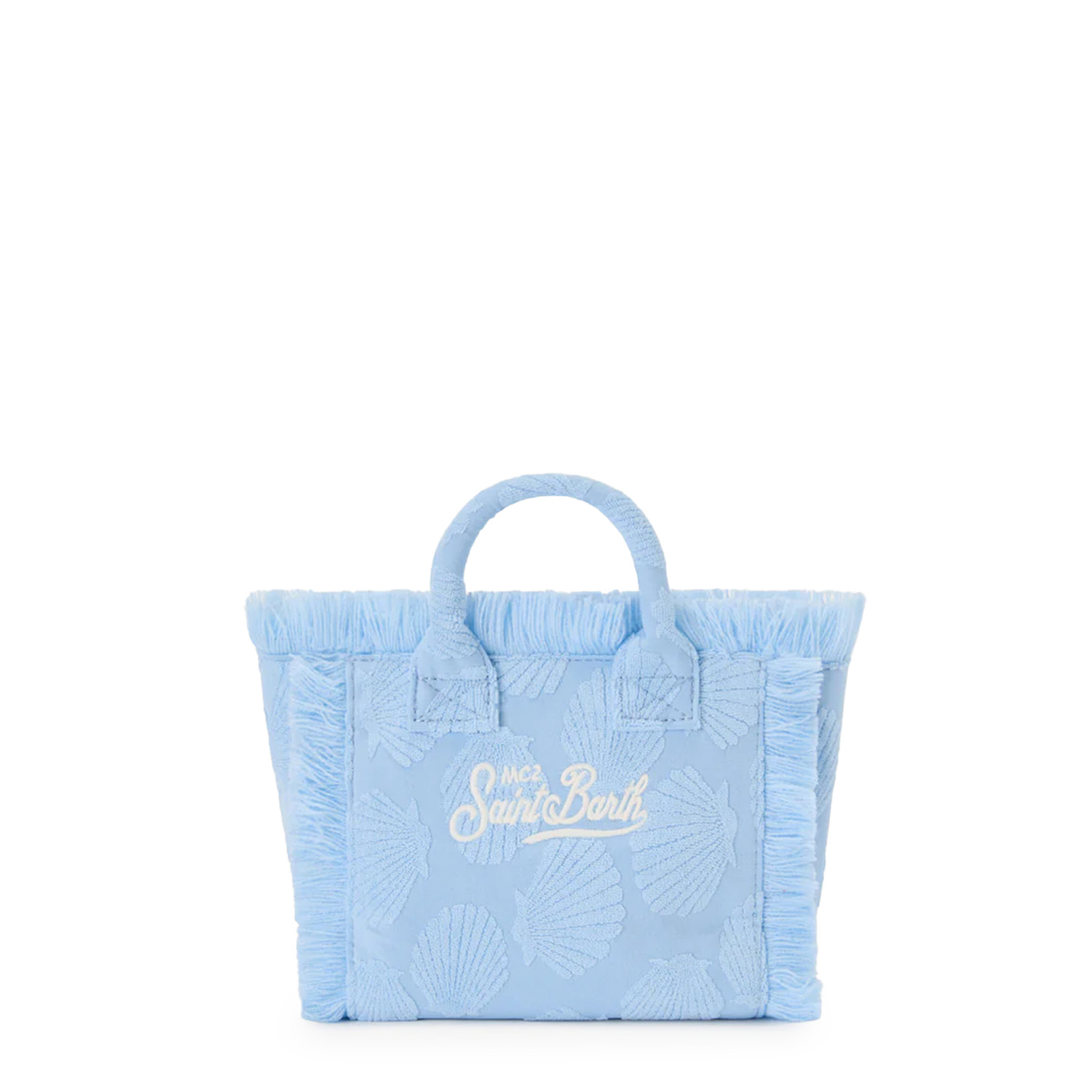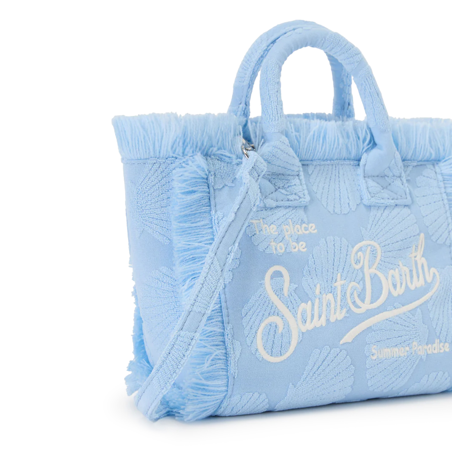 Geantă mini Vanity cu detalii în relief în formă de scoici. Într-o nuanță delicată de albastru, decorată cu franjuri și logo brodat. Dispune de o baretă de umăr reglabilă și detașabilă.