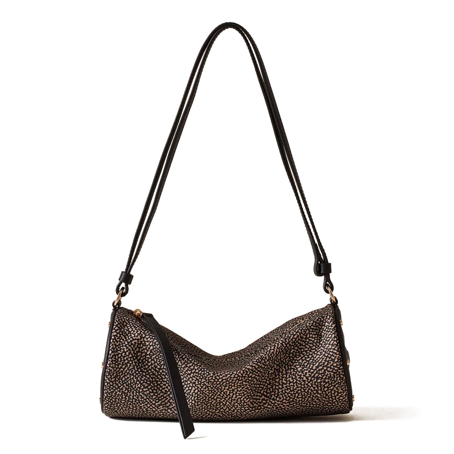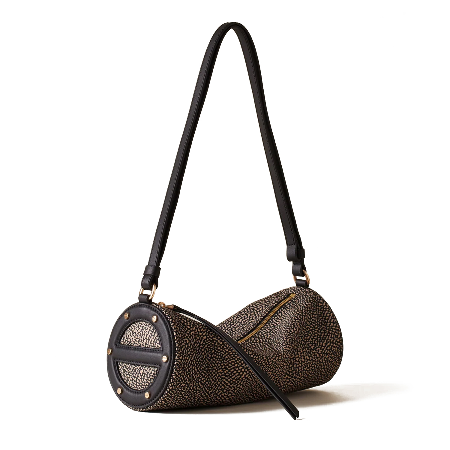 Poșetă, confecționată din material textil reciclat cu imprimeu Op și detalii din piele. Dispune de fermoar metalic, elemente decorative laterale și o curea de umăr reglabilă – perfectă pentru stilul cotidian. Finalizată cu accesorii metalice aurii mate.